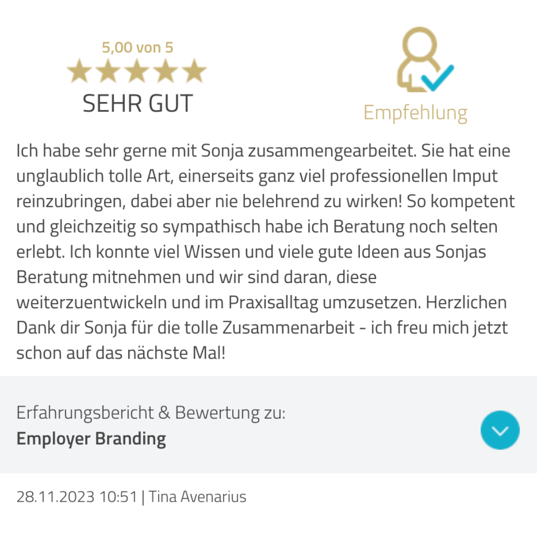 Ich bin absolut begeistert von der Zusammenarbeit und dem Ergebnis! Sonja und Steffen, sowie das ganze Team, haben meine Homepage und Logo nicht nur professionell und modern erstellt, sondern sich auch um technische Details perfekt gekümmert. Die Betreuung und Kommunikation war von Anfang bis Ende top - bei Fragen oder technischen Problemen waren sie immer sofort zur Stelle und haben sich wirklich Zeit für mich genommen. Meine Wünsche und Ideen wurden berücksichtigt und stimmig umgesetzt, so dass ich eine sehr gute Homepage bekommen habe. Ich kann Sonja und Steffen und das Team uneingeschränkt weiterempfehlen und bin sehr dankbar für die großartige Zusammenarbeit!